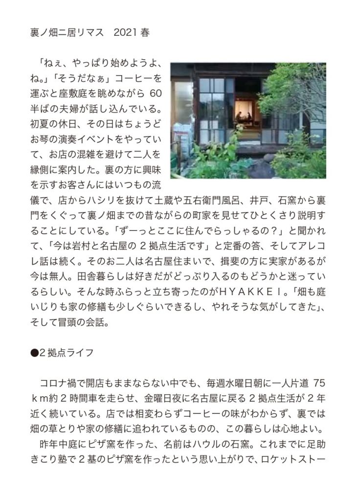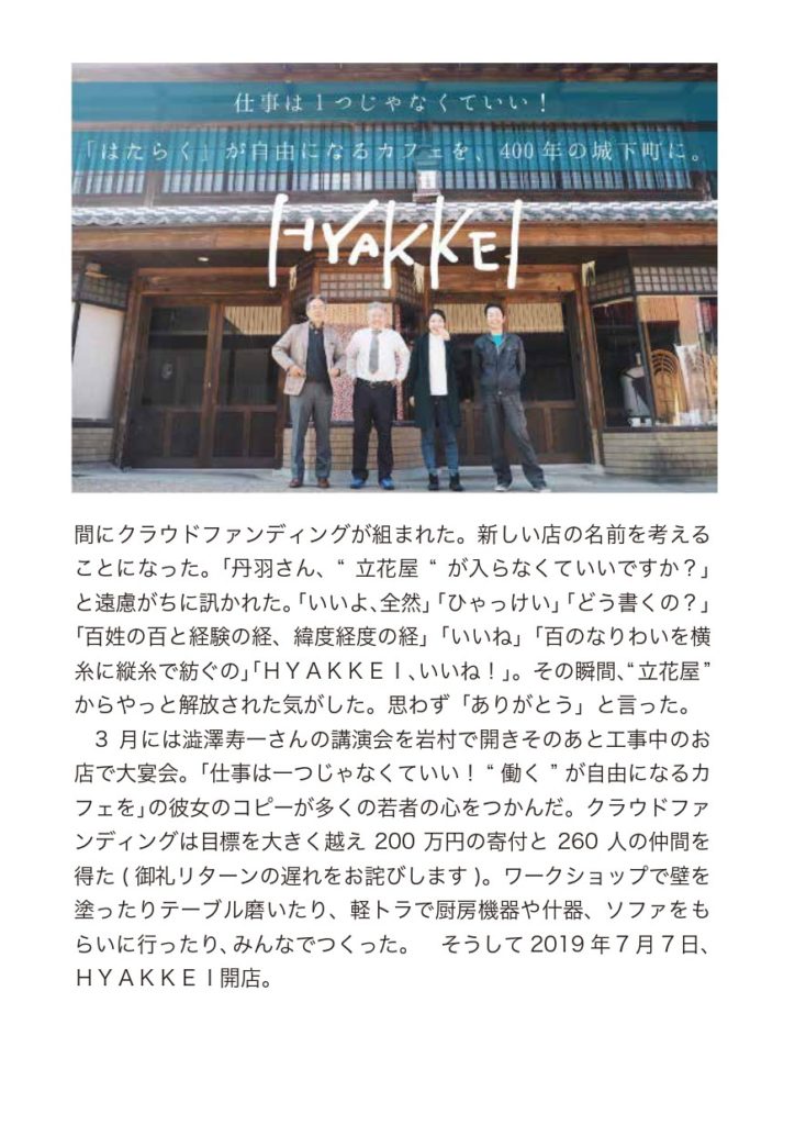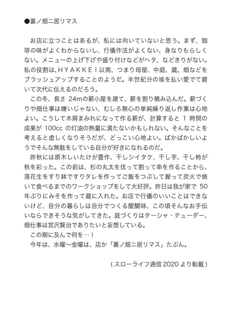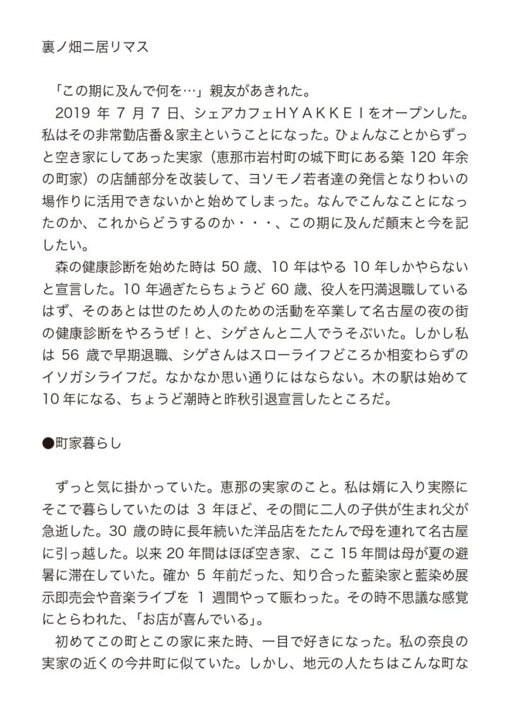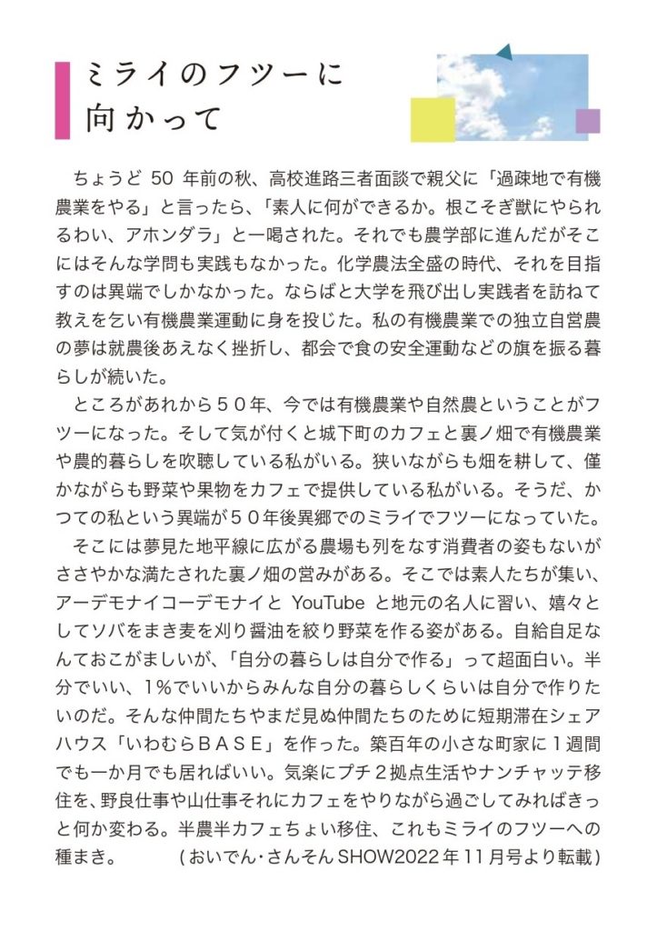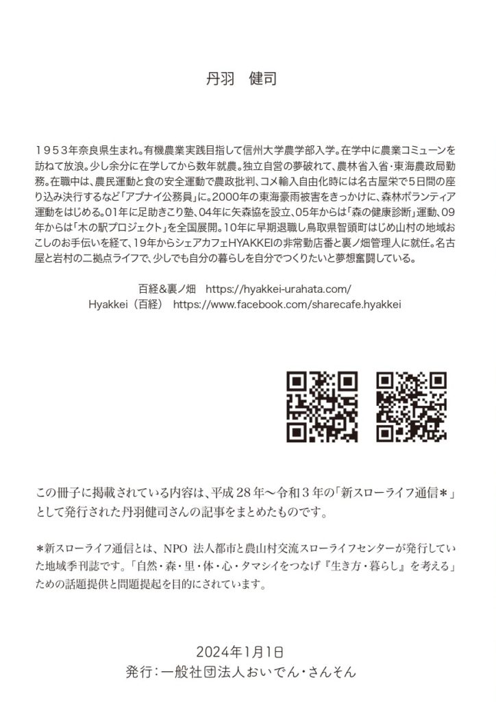 ↓ 2015~21年の「新スローライフ通信」の連載記事と、おいでんさんそんセンター機関誌に掲載された記事をおいでんさんそんセンターで冊子にして2024年1月に配布して下さったものです。 HYAKKEIの創設エピソードかもしれません。